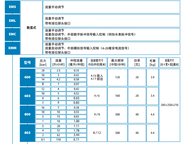 Tekba EMS系列電磁隔膜計量泵,是一款基于微處理器控制的數顯式電磁隔膜計量泵,具有操作簡單,運行穩定的特點。包括4個子系列:EMS,EML,EMC和EMM。